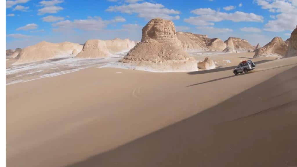 Proceed to the Crystal Mountain a natural wonder sparkling with clear quartz crystals reflecting the desert sun Then drive through Agabat Valley the “Wonder Valley” surrounded by unique limestone formations sculpted by the wind Finally reach the White Desert National Park where surreal white chalk formations create a breathtaking landscape